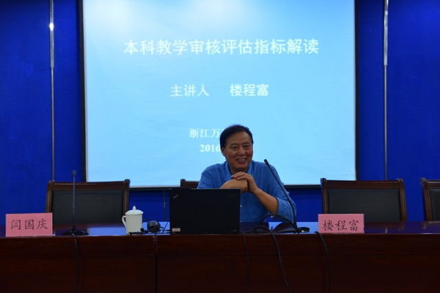 教育部审核评估专家、原浙江大学教务处处长楼程富教授应邀作专题讲座,结合其工作实践和思考阐述了本科教学审核评估要点。楼教授介绍了新时期“五位一体”评估制度,对普通高校本科审核评估的范围、特点和流程作了解读。他强调,学校自评很重要,重规范更重内涵 ,重数量更重质量,重硬件更重软件,重点衡量“五个度”,即人才培养目标与培养效果的达成度、办学定位和人才培养目标与社会发展的适应度,教师和教学资源条件的保障度、教学和质量保障体系运行的有效度、学生和社会用人单位的满意度。要坚持“以评促建、以评促改”的思想,客观分析教学存在的问题,有针对性采取措施和方法。同时要充分展示教改建设的成果,尤其是我们学校在应用型示范高校建设中创新办学理念和办学机制的特色。