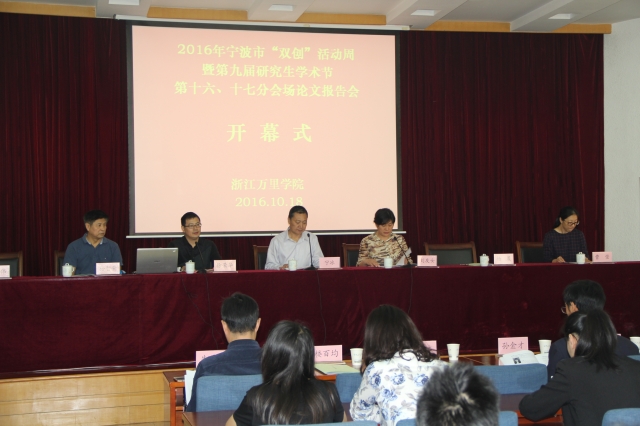 10月18日上午,2016年宁波市“双创”活动周暨第九届研究生学术节第十六、十七分会场论文报告会在浙江万里学院举行。来自市科协、宁波大学、兵科院宁波分院、浙江大学宁波理工学院、中科院材料所等兄弟高校院所的领导、嘉宾及评委老师出席本次报告会,论文报告人、研究生及联合培养研究生120余人参加了报告会。