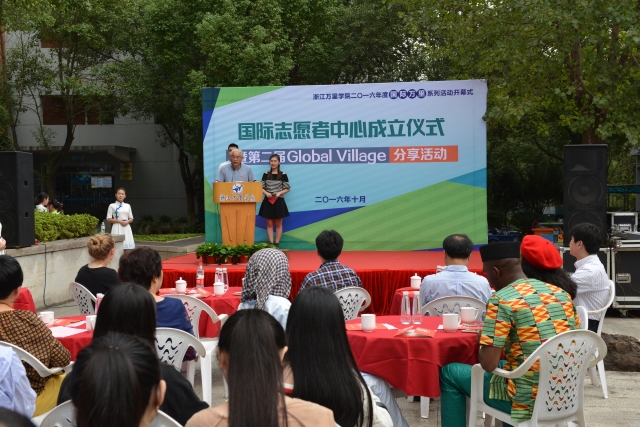 10月18日下午的生活区小广场,桂花飘香,欢歌笑语,国际志愿者中心成立仪式暨第二届Global Village分享活动在这里隆重举行。执行校长应敏、校党委副书记王伟忠、“国际万里”组委会各领导、老师以及来自32个国家的84名留学生共同参与了本次活动。