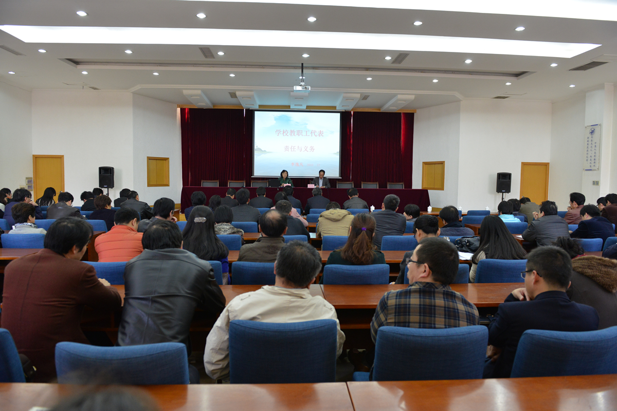 |   12月3日下午,学校在行政楼212会议室举办了第五次教职工暨工会会员代表大会代表培训会。会议由校党委书记、执行校长陈厥祥主持。新当选的146名第五次“双代会”代表参加了培训。为进一步提高“双代会”代表的参政议政能力,使他们能更好地行使当家作主的民主权利,学校特邀请浙江省教育工会主席李逸凡就《学校教职工代表责任与义务》作了专题培训报告。李主席从教代会制度的发展、教代会的职权、教职工代表大会代表、教代会的组织规则、教代会与工会的关系、教代会代表的提案等六个方面进行了深入浅出的阐述。报告具体详实,具有针对性、适用性和可操作性,增进了与会代表的主人翁意识,提升了代表的参政素养,为代表在今后的工作实践中进一步结合学校的发展并创新性地履行代表职责,提供了学习、借鉴的方法和途径,为开好第五次“双代会”奠定了良好的基础。