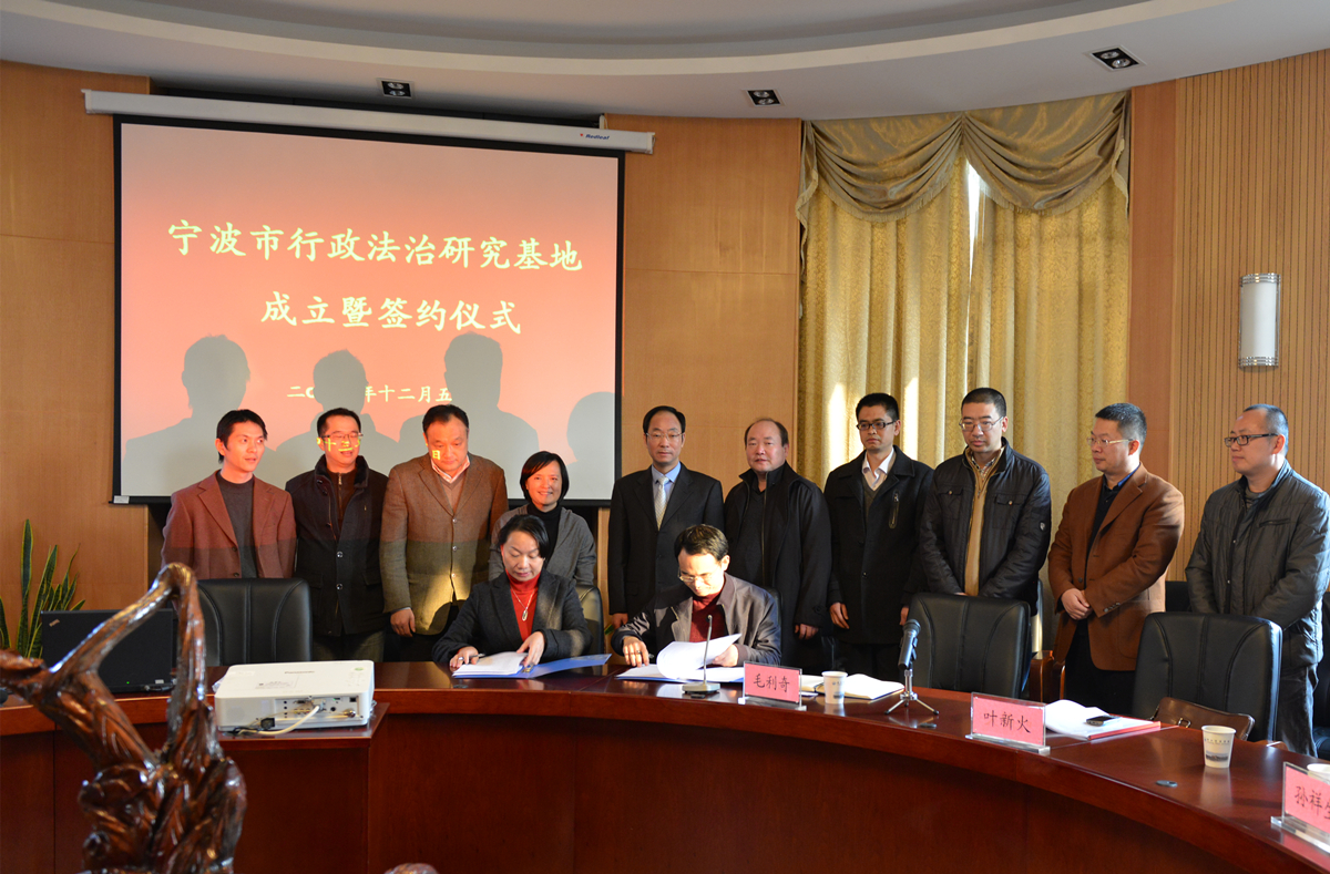 近年来,我校法学院与宁波市人民政府法制办联合开展了多项课题研究,建立了良好的合作关系。今年9月份,经学校法学院与宁波市人民政府法制办领导认真协商,决定建立更加紧密的合作关系,联合打造具有固定研究方向、固定研究团队、固定经费保障的科研平台与学术团队——宁波市行政法治研究基地。该主要承担全市行政法治课题研究及其相关学术活动的组织工作,定期组织行政法治研究论坛、讲座、研讨会等学术活动。除了承担常规行政法治课题研究之外,基地还承担宁波市法制办委托的行政立法评估、立法调研、行政规范性文件的审查、政策咨询等工作。