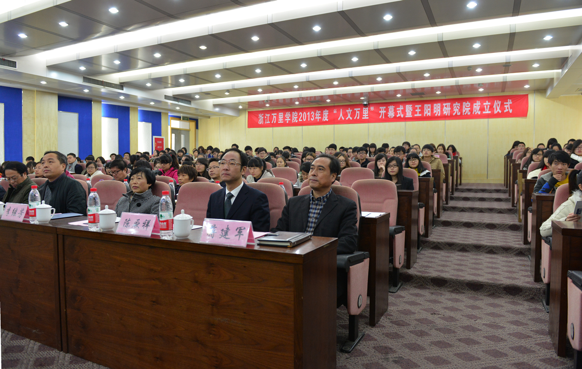 12月9日下午,我校2013年度“人文万里”系列活动开幕式暨王阳明研究院成立仪式在图书馆报告厅举行。校党委书记、执行校长陈厥祥,校党委副书记、副校长蒋建军,以及本年度“人文万里”组委会委员等相关领导出席了活动。新成立的王阳明研究院由学校主管,挂靠在学生事务与发展中心。成立仪式上,陈厥祥书记将研究院的牌匾授予挂靠部门负责人,并将上海古籍出版社出版的六套《王阳明全集》赠予研究院。随后进行了网上阳明学堂的展示,阳明学堂由“心学”精髓、“心学”视频、“心学”书籍、“心学”研习营、精彩图片等六个部分组成,其资源面向师生与社会人士免费开放。