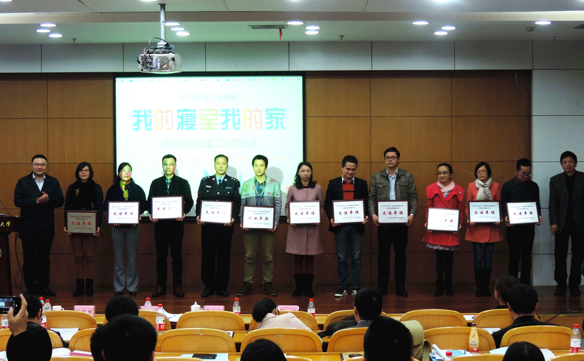 12月8日,由省文明办、团省委、省教育厅、省学联共同主办的2013年浙江省高校文明寝室创建工作推进会在浙江财经大学举行。我校被评为“浙江省文明寝室创建工作先进单位”。商学院静雅楼(14)#310等34个寝室荣获“浙江省大学生文明寝室”。团省委副书记朱斌、省内各高校团委书记以及学生会主席现场观看了各高校文明寝室创建工作成果图片展。我校的文明寝室建设主题展板,集中呈现了学校健全完善的机制保障、人性化的设施配备、文明和谐的寝室文化、显著的创建成效等特色。朱斌副书记对我校独具特色的以学生干部为推进典范而引领文明寝室创建风尚的制度建设、凝练特色文化育人的举措等方面予以肯定,并在总结讲话中两次提到我校的创建工作特色。