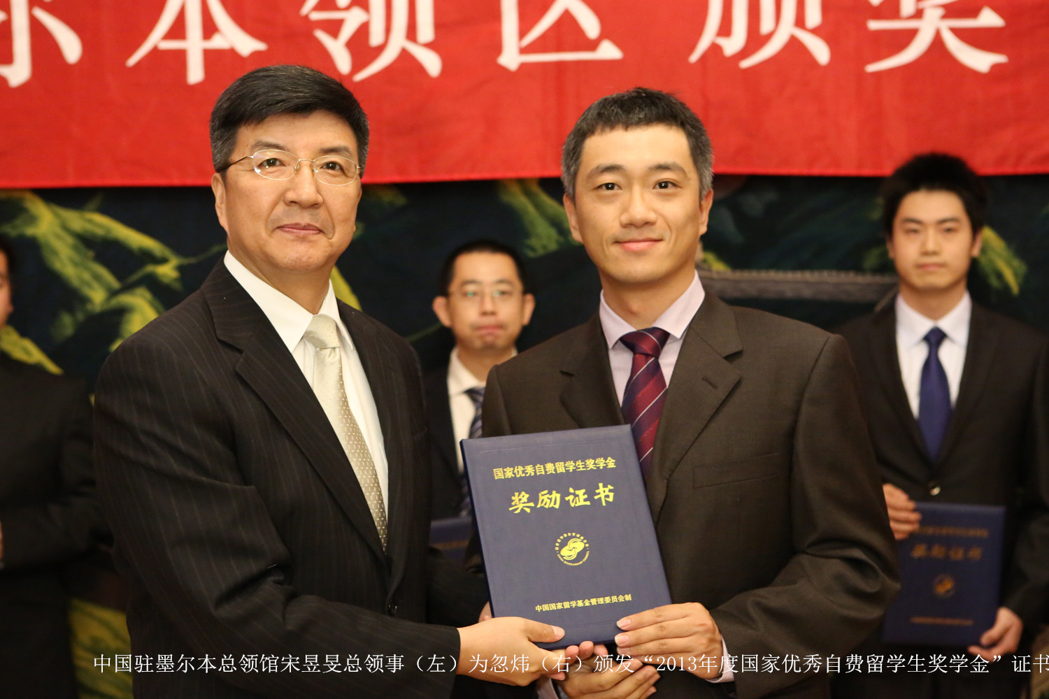 “能够获得2013年国家优秀自费留学生奖学金,尤其是作为澳大利亚塔斯马尼亚大学的首位此奖项获得者,我感到十分高兴和光荣,也很珍惜这一份荣誉。”忽炜,我校国际商务专业2005届毕业生。近日,他参加了中华人民共和国驻墨尔本总领事馆举办的“2013年度国家优秀自费留学生奖学金墨尔本领区”颁奖典礼。 “国家优秀自费留学生奖学金”是中国政府奖励给海外中国留学生的最高荣誉,而忽炜是这项奖项设立以来塔斯马尼亚大学首批 (排列第一) 获得该奖项的学生(塔斯马尼亚州唯一的大学),塔斯马尼亚大学对此也高度重视。