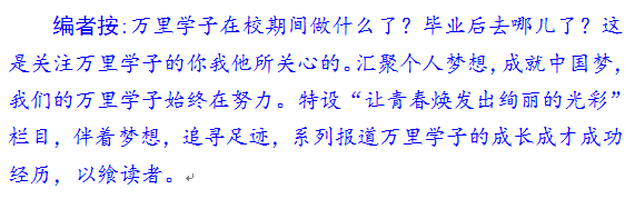 “奇迹之树”:孝敬父母、感恩母校 十年,由于求学和工作的原因,詹树很少有时间陪自己的父母,思乡之情随着岁月的流逝只增不减。2004年6月,詹树在他的毕业典礼上,描述了一个让所有人都感受至深的场景:参加全国范围内的财政部公务员选拔考试,回眸向父母挥手告别,猛然发现父母两鬓斑白,脊背已不再挺拔,那一瞬间他的心中五味杂陈,既心酸,又涌动出庄严的使命感。 2013年5月,上了年纪的父母不顾长途艰难,从温州飞到北京去看久别了的儿子,詹妈妈还特地带去了在家乡寺庙里亲自求来的上上签,只为告诉詹树在外求学要好好照顾自己。虽然与家人总是聚少离多,但在詹树眼里家庭永远是摆在第一位的,“人最重要的是平衡家庭、事业和学业,这个顺序不能乱。” 同时,作为万里的骄傲,并且被大家视为万里的一颗“奇迹之树”,詹树毕业十年间,从未忘记母校的养育之恩。他一有机会便会鼓励学弟学妹们要敢于创业,也提醒着后辈们要珍惜与同学和老师的缘分,因为人生很长也很短,要留住岁月的美好。“回首向来萧瑟处,归去,也无风雨也无晴。人生有低谷也有高潮,才算得上人生。”面对匆匆的学习生涯和未知的前景,詹树感慨道。 大学毕业至今,詹树用了十年的时光,走得稳健而激昂,继续深造的同时不忘在工作中磨练自己,他用实际经历践行着“博学明辩,厚德尚能”的精神,他是这么的自信而突出,成熟而笃定,面对一双双期许的目光,詹树用行动告诉世人他是一颗有理想有韧劲的参天大树!